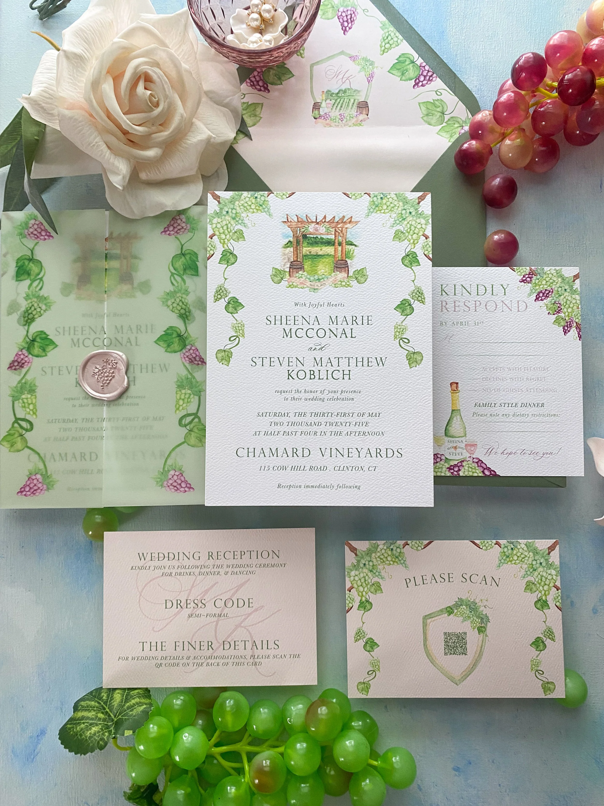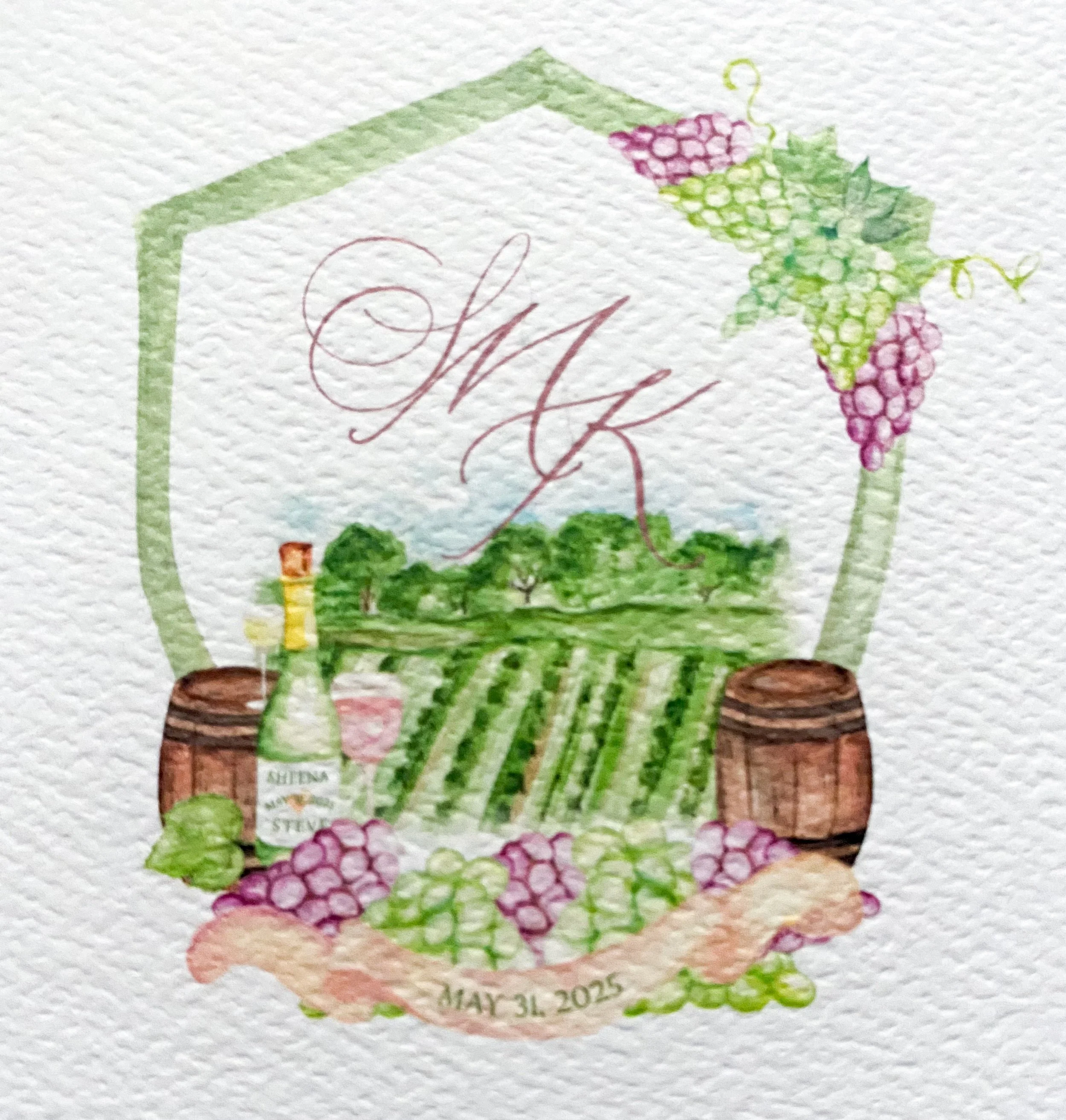 This custom venue illustration suite is near and dear to my heart! I created this suite for my best friend since high school, who loves all things antique/vintage. I was so honored to bring her dreams to life in an original watercolor painting of her historic Connecticut bed & breakfast venue.