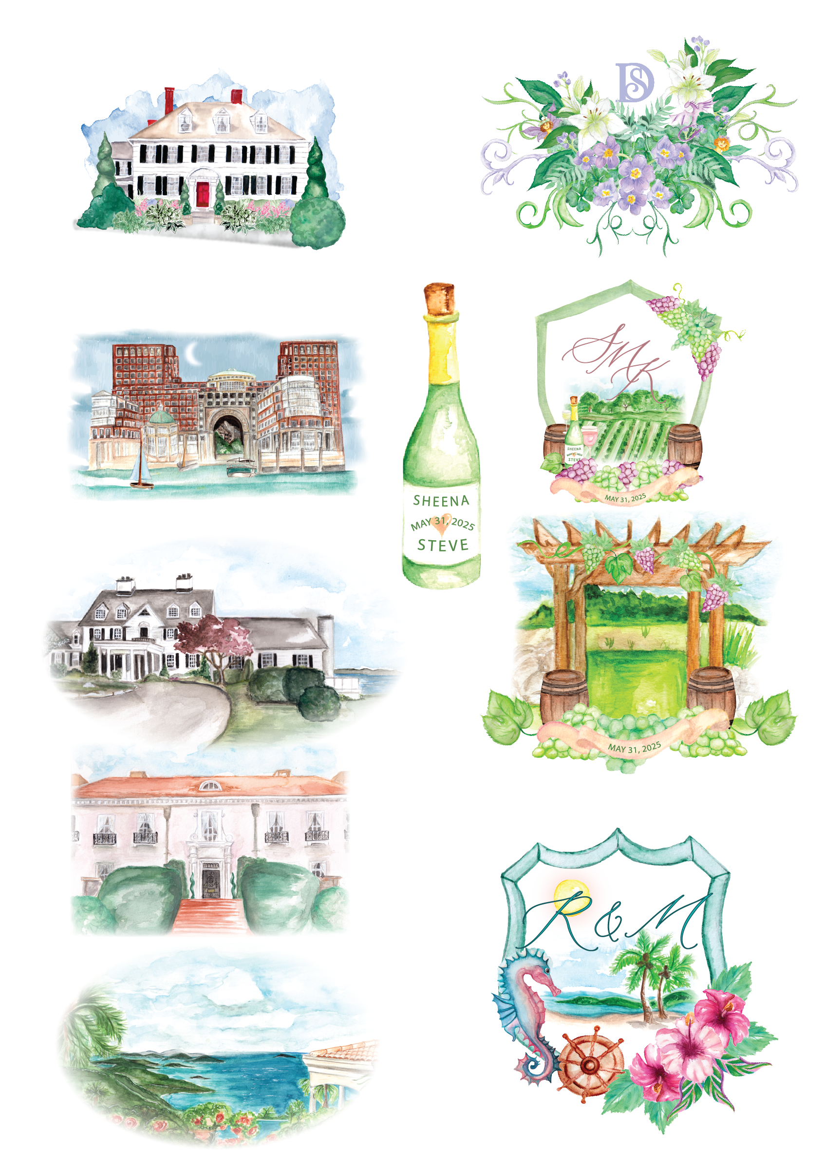 Original watercolor artwork brings an extra layer of meaning to your wedding stationery. From venue portraits and custom monograms to meaningful locations, florals, and personal details, each illustration is thoughtfully created to reflect your story. These one-of-a-kind elements can be incorporated throughout your invitation suite and day-of paper, creating a cohesive and artful experience that feels entirely your own.