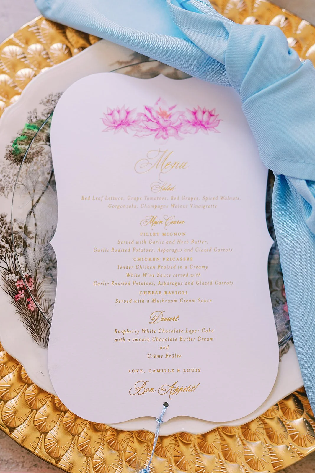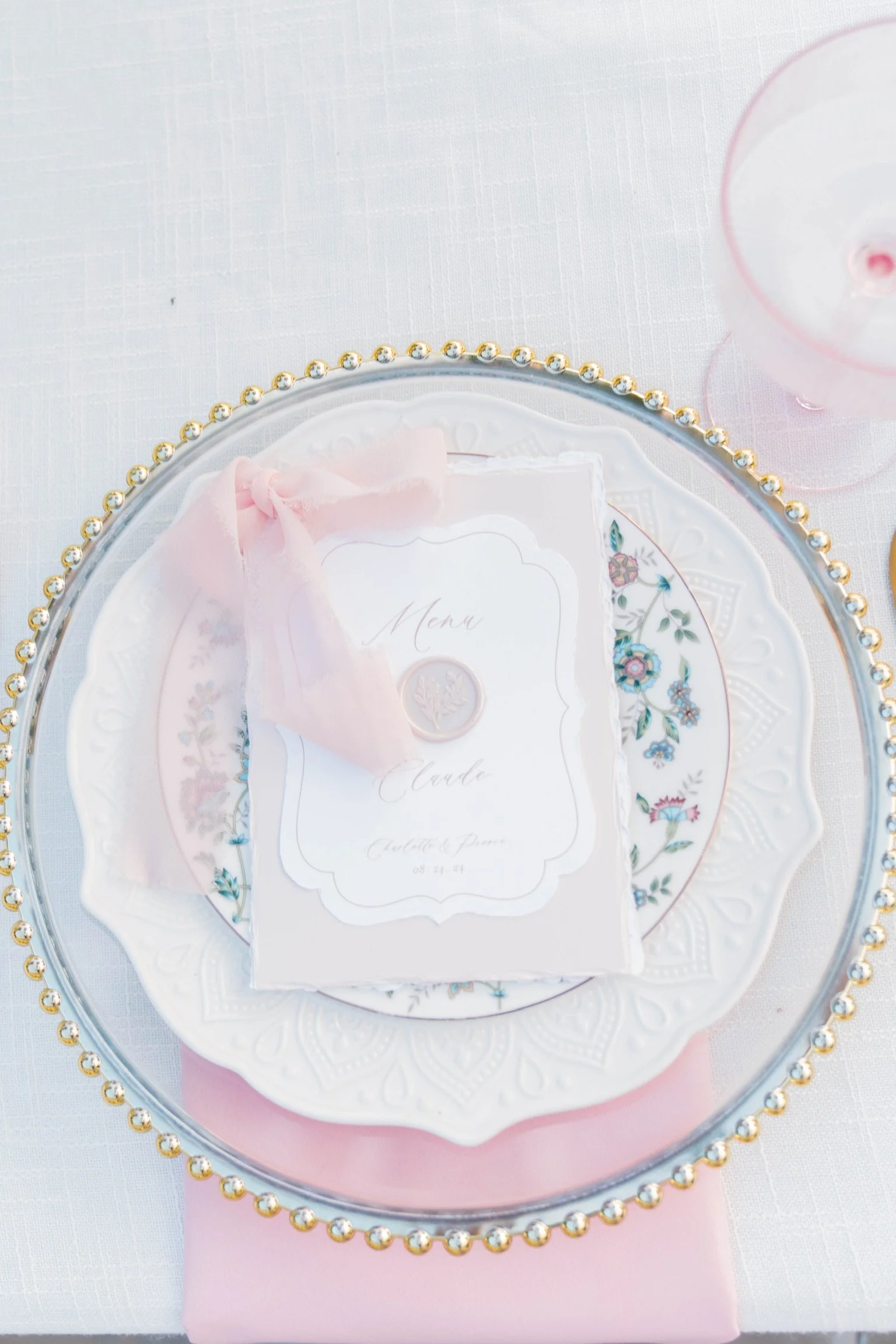 The paper details that carry your design story through the entire celebration. From ceremony programs and vow books to welcome signage, menus, table numbers, and custom reception pieces, each element is thoughtfully designed to complement your suite and create a cohesive, beautifully layered experience.