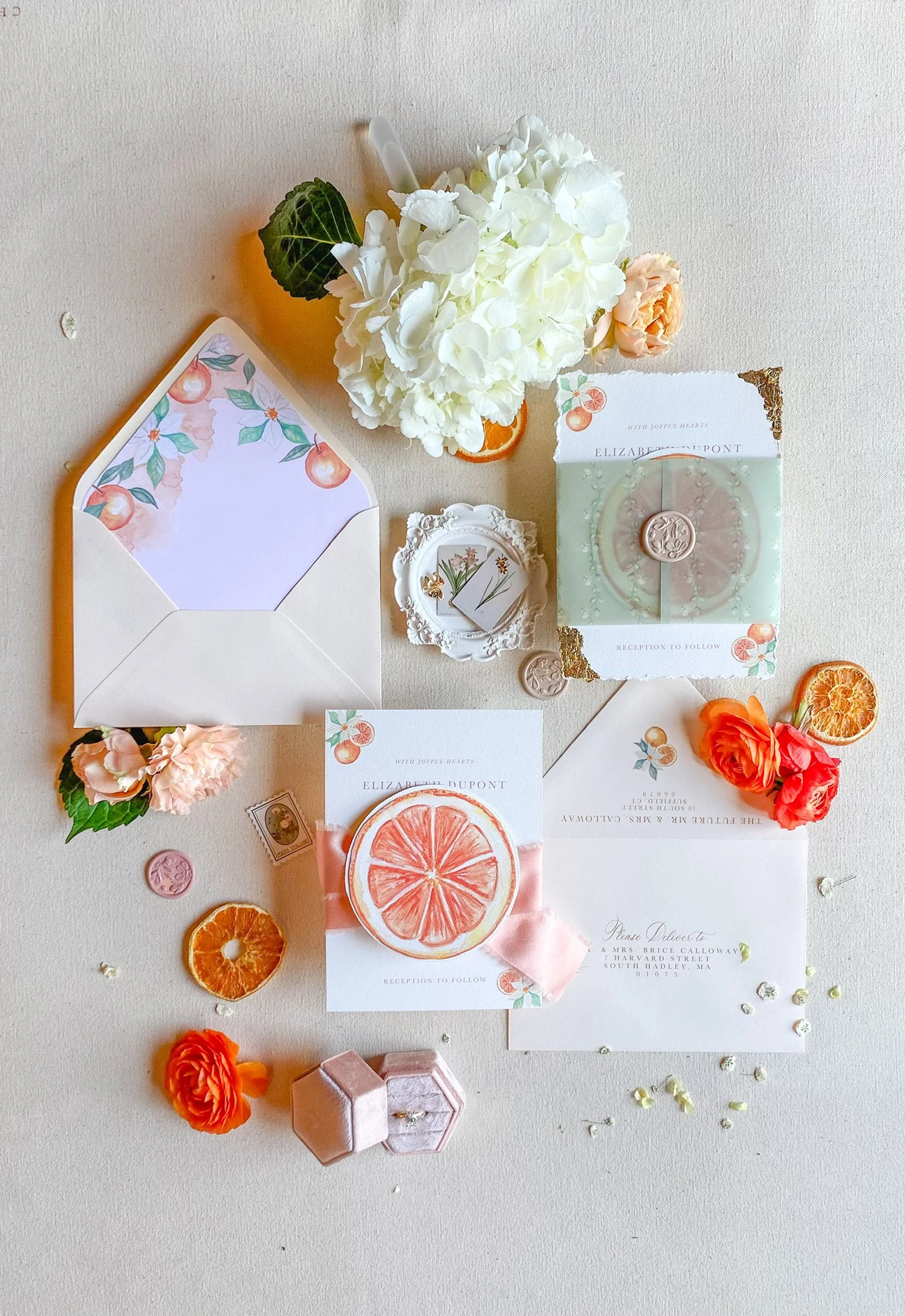 This includes your save the dates and full invitation suite, complete with the invitation, reply card and printed return envelope, and any accompanying detail cards. Professionally printed. Carefully assembled. Finished exactly as you choose, whether that includes wax seals, vellum accents, ribbon, or envelope liners.
